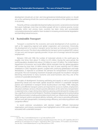 Sustainable Transport Transport is essential for the economic and social development of all countries as well as for supporting regional and global cooperation and economies. Historically, the development of a country’s transport sector has been an indicator of its economic welfare and success. The direct value added by the transport sector to global GDP is about 3-5 per cent, and transport typically provides 5-8 per cent of average national total paid employment. Between 1950 and 1990, the number of motorized vehicles in the world grew by roughly nine times, from about 75 million to 675 million. During the same period, the world population doubled, from about 2.55 billion to near 5.25 billion. The United Nations Department of Economic and Social Affairs (DESA) estimates that the global population will increase by more than 2.5 billion during the next 35 years reaching over 9.5 billion inhabitants in 2050. Population growth, coupled with continuing globalization and trade liberalization, is expected to accelerate the demand for transportation of both people and goods. The ever-increasing movement of people and goods has resulted in transport becoming instrumental to many economic and social functions and, thus, one of the controls of sustainable development. Principles of development (increasing well-being and equity) as well as sustainability (preserving natural and man-made capital) should be inherent in sustainable transport policies and manifested in transport trends (Gudmundsson and Höjer, 1996). Adequate, efficient, and effective transport systems are important for access to markets, employment, education and basic services critical to poverty alleviation; at the same time, transportation is expected to be a major driving force behind a growing world demand for energy and it has a significant environmental footprint. Therefore, integrated approaches to policymaking should be promoted, including policies/planning for land use, infrastructure development, public transport systems and goods delivery networks, with a view to providing affordable, efficient and safe transportation, increasing energy efficiency, and reducing pollution and congestion effects.3 In recent extensive consultations with decision makers4, different international organisations and industry associations have highlighted some of the current challenges associated with sustainable transport.