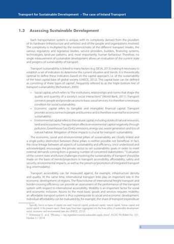 The economic, social and environmental pillars of sustainability are closely linked and a single policy distinction between these pillars is neither possible nor beneficial. In fact, the close linkage between all aspects of sustainability and efficiency, once understood and acknowledged, encourages the private sector to set sustainability goals in order to meet external demands coming from a growing number of concerned stakeholders. 8 Evaluation of the current state and future challenges involving the sustainability of transport should be made on the basis of trends/projections in transport accessibility, affordability, safety and security, environmental impacts, as well as the presence/promotion of integrated transport (e.g. intermodality). Transport accessibility can be measured against, for example, infrastructure density and quality. At the same time, international transport links play an important role in the economic development of regions. The flow/volume of international freight transport and border-crossing efficiency can provide an assessment of the performance of the transport system with respect to international accessibility. Mobility is an important factor for social and economic inclusion. Access to the most basic goods and services requires mobility; an affordable transport system is thus a prerequisite to social and economic development. Individual affordability can be evaluated by, for example, the share of transport expenditure Typically, five to six types of capital are used: financial capital, produced capital, natural capital, human capital and social capital. In the present report, these types have been aggregated into the three pillars of sustainable development: social, economic and environmental (see also UNECE, 2012).