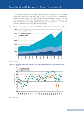 In recent years, economic growth has been consistently higher in the low- and middleincome economies than in the developed countries (Figures 2.2 and 2.3). Nevertheless, average per capita growth may hide increasing income inequalities (Dervis, 2012) that undermine prospects for sustainable development (Berg and Ostry, 2011), threaten economic stability (Stiglitz, 2012), impact on transportation patterns (e.g. Lau, 2011) and, ultimately, affect the sustainability of the transport sector. Figure 2.1
