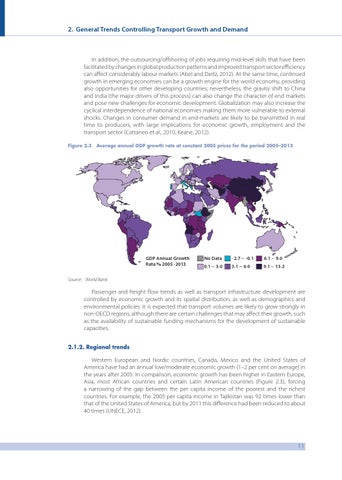 Passenger and freight flow trends as well as transport infrastructure development are controlled by economic growth and its spatial distribution, as well as demographics and environmental policies. It is expected that transport volumes are likely to grow strongly in non-OECD regions, although there are certain challenges that may affect their growth, such as the availability of sustainable funding mechanisms for the development of sustainable capacities. 2.1.2. Regional trends