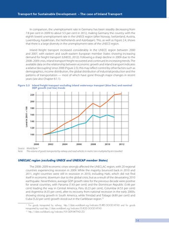 In comparison, the unemployment rate in Germany has been steadily decreasing from 7.8 per cent in 2009 to about 5.5 per cent in 2012, making Germany the country with the eighth lowest unemployment rate in the UNECE region (after Norway, Switzerland, Austria, Luxemburg, Kazakhstan, the Netherlands and Azerbaijan). This, as well as Figure 2.4, shows that there is a large diversity in the unemployment rates of the UNECE region. Inland freight transport increased considerably in the UNECE region between 2000 and 2007, with eastern and south-eastern European member States showing increasing demand for freight transport (UNECE, 2012). Following a sharp decline in 2009 due to the 2008–2009 crisis, inland transport freight recovered and continued its increasing trends. The available data on the relationship between economic growth and inland transport indicates a relative ‘decoupling’ since 2000 (Figure 2.5); this may reflect control by other factors such as demographics, income distribution, the global distribution of industrial production and the patterns of transportation — most of which have gone through major changes in recent years (see also Chapter 8.1.1). Figure 2.5