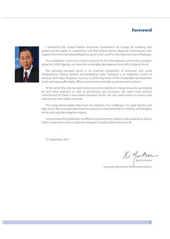 I commend the United Nations Economic Commission for Europe for initiating and producing this paper in cooperation with the United Nations Regional Commissions with support from the International Road Transport Union and the International Union of Railways. This publication comes at a critical moment for the international community as leaders adopt the 2030 Agenda, our vision for sustainable development and a life of dignity for all. The growing transport sector is an essential component of economic and social development, linking markets and facilitating trade. Transport is an important source of revenue and major employer. Success in achieving many of the Sustainable Development Goals will require affordable, efficient and environmentally sound transport systems. At the same time, the transport sector consumes significant energy resources, generating air and noise pollution as well as greenhouse gas emissions. We need more political commitment to foster a low-carbon transport future. We also need action to reduce road crashes and other traffic accidents. This study demonstrates that there are solutions. Our challenge is to share lessons and take action. We must generate more innovations to meet demands for mobility and transport while reducing their negative impacts. I recommend this publication to officials in government, industry and academia as well as others interested in how to optimize transport to build a better future for all.
