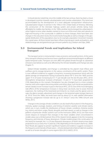 Environmental Trends and Implications for Inland Transport The transport sector is instrumental in many economic and social functions. At the same time, transport infrastructure/services have a significant environmental footprint at different spatio-temporal scales. Transport can even affect the global climate through its substantial emissions (see below) as well as be affected by the Climate Variability and Change (see also Chapter 7). Global Climate Variability and Change is controlled by the planet’s heat inflows and outflows and its storage dynamics in the various constituents of the earth’s system. There is now sufficient evidence to suggest a long-term, increasing temperature trend, with the global average air temperature having increased by about 0.8 °C since the 1850s and the upper 75 m of ocean increasing by 0.11 °C per decade over the last 40 years (IPCC, 2013). Atmospheric temperature increases of between 1.0 and 3.7 °C have been projected for 2100, depending on the scenario. Precipitation has also changed, but in a more complex manner, with some regions becoming wetter and others dryer; such trends are predicted to remain steady or even increase in pace in the future (IPCC, 2013). One of the most damaging side-effects of the temperature increases is rising mean sea levels, due to ocean thermal expansion, the melting of the Greenland and Antarctic ice sheets and the glacier and ice caps, the glacio-isostatic adjustment and changes in the terrestrial water storage (Hanna et al., 2013). Since the 1860s, sea levels have risen by about 0.2 m, with satellite information showing a progressive increase rate (to up to 3.1 mm/yr-1) since the 1990s (Church and White, 2011). Changes in the average climate conditions can also lead to fluctuations in the frequency, intensity, spatial coverage, duration, and timing of extreme weather and climate events, which can, in turn, modify the distributions of future climatic conditions. Extreme events (e.g. storms and storm surges, floods, droughts and heat waves), as well as changes in the patterns of particular climatic systems such as the monsoons (SREX, 2012), can have more severe impacts on transport than changes in the mean variables when concentrated in smaller areas over a limited period. One of the clearest trends appears to be the increasing frequency and intensity of heavy downpours. Climate models project the continuation of this trend; for example, the 1 in 20 year (heaviest) downpours of North America have been projected to occur every 4 to 15 years by 2100, depending on the location (Karl et al., 2009). River floods also appear to present significant hazards and evidence suggests increases in the frequency and intensity of heat waves—of extended periods of abnormally hot weather, as well as of severe droughts in some regions (EEA 2012; UNECE, 2013).