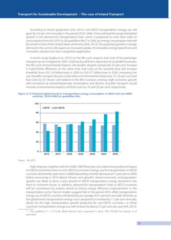 High oil prices, together with the 2008–2009 financial crisis, had a more profound impact on OECD economies than on non-OECD economies. Energy use for transportation in OECD countries declined by 2 per cent in 2008, followed by a further decrease of 3.1 per cent in 2009, before recovering in 2010 (about 0.8 per cent growth). Slower economic and population growths are likely to drive a slow growth in OECD transportation energy demand in the short to mid-term future. In addition, demand for transportation fuels in OECD countries will be constrained by policies aimed at strong energy efficiency improvements in the transportation sector. Recent studies suggest that in the period 2010–2040, transportation energy use in OECD countries will decline by an average of 0.1 per cent annually. Whereas, at the global level, transportation energy use is projected to increase by 1.1 per cent annually, driven by the high transportation growth projected for non-OECD countries—in these countries, transportation energy use will increase by about 2.3 per cent per year (EIA, 2013). 22 One quadrillion (1 x 1015) Btu (British thermal units) is equivalent to about 180,136,000 boe (barrels of oil equivalent)