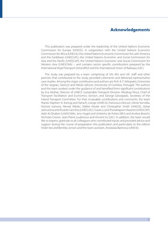 This publication was prepared under the leadership of the United Nations Economic Commission for Europe (UNECE), in cooperation with the United Nations Economic Commission for Africa (UNECA), the United Nations Economic Commission for Latin America and the Caribbean (UNECLAC), the United Nations Economic and Social Commission for Asia and the Pacific (UNESCAP), the United Nations Economic and Social Commission for Western Asia (UNESCWA) – and contains sector specific contributions prepared by the International Road Transport Union(IRU) and the International Union of Railways (UIC). The study was prepared by a team comprising of UN, IRU and UIC staff and other partners that contributed to the study, provided comments and delivered representative case studies. Among the major contributors and authors are Prof. A. F. Velegrakis (University of the Aegean, Greece) and Nikola Sahovic (University of Coimbra, Portugal). The authors and the team worked under the guidance of and benefited from significant contributions by Eva Molnar, Director of UNECE Sustainable Transport Division, Miodrag Pesut, Chief of Transport Facilitation and Economics Section, and George Georgiadis, Secretary of the Inland Transport Committee. For their invaluable contributions and comments, the team thanks Stephen N. Karingi and Tama R. Lisinge (UNECA), Francesco Dionori, Olivier Kervella, Victoria Ivanova, Nenad Nikolic, Walter Nissler and Christopher Smith (UNECE), Azhar Jaimurzina and Ricardo Sanchez (UNECLAC), Yuwei Li and Thanattaporn Rasamit (UNESCAP), Adel Al-Ghaberi (UNESCWA), Jens Hugel and Umberto de Pretto (IRU) and Andrea Braschi, Nicholas Craven, Jean-Pierre Loubinoux and Vincent Vu (UIC). In addition, the team would like to express gratitude to all colleagues who contributed inputs and provided advice and support during the course of preparation this publication and particularly to the editors Violet Yee and Bentley Jensen and the team assistant, Anastasia Barinova (UNECE).