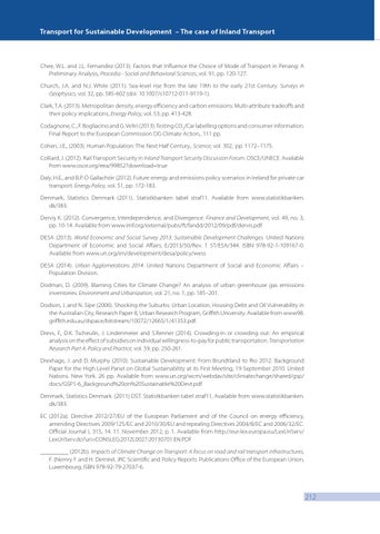 Chee, W.L. and J.L. Fernandez (2013). Factors that Influence the Choice of Mode of Transport in Penang: A Preliminary Analysis, Procedia - Social and Behavioral Sciences, vol. 91, pp. 120-127. Church, J.A. and N.J. White (2011). Sea-level rise from the late 19th to the early 21st Century. Surveys in Geophysics, vol. 32, pp. 585-602 (doi: 10.1007/s10712-011-9119-1). Clark, T.A. (2013). Metropolitan density, energy efficiency and carbon emissions: Multi-attribute tradeoffs and their policy implications, Energy Policy, vol. 53, pp. 413-428. Codagnone, C., F. Bogliacino and G. Veltri (2013). Testing CO2/Car labelling options and consumer information. Final Report to the European Commission DG Climate Action,. 111 pp. Cohen, J.E., (2003). Human Population: The Next Half Century,. Science, vol. 302, :pp. 1172–1175. Colliard, J. (2012). Rail Transport Security in Inland Transport Security Discussion Forum. OSCE/UNECE. Available from www.osce.org/eea/99852?download=true Daly, H.E., and B.P. Ó Gallachóir (2012). Future energy and emissions policy scenarios in Ireland for private car transport. Energy Policy, vol. 51, pp. 172-183. Denmark, Statistics Denmark (2011). Statistkbanken tabel straf11. Available from www.statistikbanken. dk/383. Derviş K. (2012). Convergence, Interdependence, and Divergence. Finance and Development, vol. 49, no. 3, pp. 10-14. Available from www.imf.org/external/pubs/ft/fandd/2012/09/pdf/dervis.pdf DESA (2013). World Economic and Social Survey 2013: Sustainable Development Challenges. United Nations Department of Economic and Social Affairs, E/2013/50/Rev. 1 ST/ESA/344. ISBN 978-92-1-109167-0. Available from www.un.org/en/development/desa/policy/wess DESA (2014). Urban Agglomerations 2014. United Nations Department of Social and Economic Affairs – Population Division. Dodman, D. (2009). Blaming Cities for Climate Change? An analysis of urban greenhouse gas emissions inventories. Environment and Urbanization, vol. 21, no. 1, pp. 185–201. Dodson, J. and N. Sipe (2006). Shocking the Suburbs: Urban Location, Housing Debt and Oil Vulnerability in the Australian City, Research Paper 8, Urban Research Program, Griffith University. Available from www98. griffith.edu.au/dspace/bitstream/10072/12665/1/41353.pdf. Drevs, F., D.K. Tscheulin, J. Lindenmeier and S.Renner (2014). Crowding-in or crowding out: An empirical analysis on the effect of subsidies on individual willingness-to-pay for public transportation. Transportation Research Part A: Policy and Practice, vol. 59, pp. 250-261. Drexhage, J. and D. Murphy (2010). Sustainable Development: From Brundtland to Rio 2012. Background Paper for the High Level Panel on Global Sustainability at its First Meeting, 19 September 2010. United Nations. New York. 26 pp. Available from www.un.org/wcm/webdav/site/climatechange/shared/gsp/ docs/GSP1-6_Background%20on%20Sustainable%20Devt.pdf Denmark, Statistics Denmark. (2011) DST. Statistkbanken tabel straf11, Available from www.statistikbanken. dk/383. EC (2012a). Directive 2012/27/EU of the European Parliament and of the Council on energy efficiency, amending Directives 2009/125/EC and 2010/30/EU and repealing Directives 2004/8/EC and 2006/32/EC. Official Journal L 315, 14. 11. November 2012, p. 1. Available from http://eur-lex.europa.eu/LexUriServ/ LexUriServ.do?uri=CONSLEG:2012L0027:20130701:EN:PDF _________ (2012b). Impacts of Climate Change on Transport: A focus on road and rail transport infrastructures, F. (Nemry F and H. Demirel, JRC Scientific and Policy Reports. Publications Office of the European Union, Luxembourg, ISBN 978-92-79-27037-6.