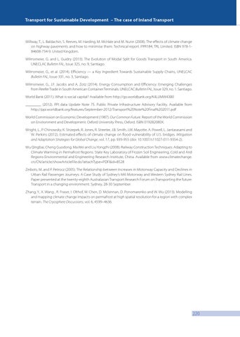 Willway, T., L. Baldachin, S. Reeves, M. Harding, M. McHale and M. Nunn (2008). The effects of climate change on highway pavements and how to minimise them: Technical report. PPR184, TRL Limited. ISBN 978-184608-734-9. United Kingdom. Wilmsmeier, G. and L. Guidry (2013). The Evolution of Modal Split for Goods Transport in South America. UNECLAC Bulletin FAL, Issue 325, no. 9, Santiago. Wilmsmeier, G., et al. (2014). Efficiency — a Key Ingredient Towards Sustainable Supply Chains, UNELCAC Bulletin FAL, Issue 331, no. 3, Santiago. Wilmsmeier, G., J.F. Jacobs and A. Zotz (2014). Energy Consumption and Efficiency: Emerging Challenges from Reefer Trade in South American Container Terminals. UNELCAC Bulletin FAL, Issue 329, no. 1. Santiago. World Bank (2011). What is social capital? Available from http://go.worldbank.org/K4LUMW43B0 ________ (2012). PPI data Update Note 75. Public Private Infrastructure Advisory Facility. Available from http://ppi.worldbank.org/features/September-2012/Transport%20Note%20Final%202011.pdf World Commission on Economic Development (1987). Our Common Future. Report of the World Commission on Environment and Development. Oxford University Press, Oxford. ISBN 019282080X. Wright, L., P. Chinowsky, K. Strzepek, R. Jones, R. Streeter, J.B. Smith, J.M. Mayotte, A. Powell, L. Jantarasami and W. Perkins (2012). Estimated effects of climate change on flood vulnerability of U.S. bridges. Mitigation and Adaptation Strategies for Global Change, vol. 17, pp. 939-955 (doi: 10.1007/s11027-011-9354-2). Wu Qingbai, Cheng Guodong, Ma Wei and Liu Yongzhi (2008). Railway Construction Techniques: Adapting to Climate Warming in Permafrost Regions. State Key Laboratory of Frozen Soil Engineering, Cold and Arid Regions Environmental and Engineering Research Institute, China. Available from www.climatechange. cn/CN/article/showArticleFile.do?attachType=PDF&id=8528 Zeibots, M. and P. Petrocz (2005). The Relationship between Increases in Motorway Capacity and Declines in Urban Rail Passenger Journeys: A Case Study of Sydney’s M4 Motorway and Western Sydney Rail Lines. Paper presented at the twenty-eighth Australasian Transport Research Forum on Transporting the future: Transport in a changing environment. Sydney, 28-30 September. Zhang, Y., X. Wang , R. Fraser, I. Olthof, W. Chen, D. Mclennan, D. Ponomarenko and W. Wu (2013). Modelling and mapping climate change impacts on permafrost at high spatial resolution for a region with complex terrain. The Cryosphere Discussions, vol. 6, 4599–4636.