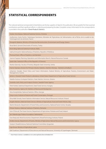 STATISTICAL CORRESPONDENTS The national statistical correspondents listed below are the key suppliers of data for this publication. We are grateful for their essential contributions and their significant efforts in collecting and preparing the data. Complete contact information for the correspondents is provided in the publication Forest Products Statistics. 1