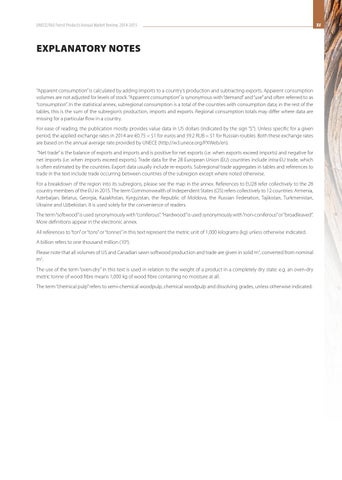 “Apparent consumption” is calculated by adding imports to a country’s production and subtracting exports. Apparent consumption volumes are not adjusted for levels of stock. “Apparent consumption” is synonymous with “demand” and “use” and often referred to as “consumption”. In the statistical annex, subregional consumption is a total of the countries with consumption data; in the rest of the tables, this is the sum of the subregion’s production, imports and exports. Regional consumption totals may differ where data are missing for a particular flow in a country. For ease of reading, the publication mostly provides value data in US dollars (indicated by the sign “$”). Unless specific for a given period, the applied exchange rates in 2014 are €0.75 = $1 for euros and 39.2 RUB = $1 for Russian roubles. Both these exchange rates are based on the annual average rate provided by UNECE (http://w3.unece.org/PXWeb/en). “Net trade” is the balance of exports and imports and is positive for net exports (i.e. when exports exceed imports) and negative for net imports (i.e. when imports exceed exports). Trade data for the 28 European Union (EU) countries include intra-EU trade, which is often estimated by the countries. Export data usually include re-exports. Subregional trade aggregates in tables and references to trade in the text include trade occurring between countries of the subregion except where noted otherwise. For a breakdown of the region into its subregions, please see the map in the annex. References to EU28 refer collectively to the 28 country members of the EU in 2015. The term Commonwealth of Independent States (CIS) refers collectively to 12 countries: Armenia, Azerbaijan, Belarus, Georgia, Kazakhstan, Kyrgyzstan, the Republic of Moldova, the Russian Federation, Tajikistan, Turkmenistan, Ukraine and Uzbekistan. It is used solely for the convenience of readers. The term “softwood” is used synonymously with “coniferous”. “Hardwood” is used synonymously with “non-coniferous” or “broadleaved”. More definitions appear in the electronic annex. All references to “ton” or “tons” or “tonnes” in this text represent the metric unit of 1,000 kilograms (kg) unless otherwise indicated. A billion refers to one thousand million (109). Please note that all volumes of US and Canadian sawn softwood production and trade are given in solid m3, converted from nominal m3. The use of the term “oven-dry” in this text is used in relation to the weight of a product in a completely dry state: e.g. an oven-dry metric tonne of wood fibre means 1,000 kg of wood fibre containing no moisture at all. The term “chemical pulp” refers to semi-chemical woodpulp, chemical woodpulp and dissolving grades, unless otherwise indicated.