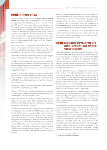 The 2015 edition of the UNECE/FAO Forest Products Annual Market Review provides a comprehensive review of market developments in the UNECE region in 2014 and the first half of 2015 and of the policies driving those developments. The UNECE region comprises three subregions: Europe; the Commonwealth of Independent States (CIS); and North America. It encompasses Canada and the United States of America (US), Europe, the Russian Federation, the Caucasus and the Central Asian republics. It includes almost all boreal and temperate forests in the Northern Hemisphere and covers about 1.7 billion hectares, which is just under half the world’s total forest area. The Review serves as a background document for the joint session of the UNECE Committee on Forests and the Forest Industry and FAO’s European Forestry Commission, which will take place on 2-5 November 2015 in Engelberg, Switzerland. This chapter constitutes an executive summary by providing an overview of the other ten chapters of the publication. Section 1.2, which follows this section, provides background on the macroeconomic health of the region. The effects of the economy are further elaborated in chapters 2-11, which outline the impacts of the economic situation on particular sectors and geographical regions. Chapter 2 provides background on the policies and market tools that are influencing the forest products sector, including those related to trade, energy and the environment (e.g. certified forest products, carbon accounting and markets, and green building). Chapter 3 is a special chapter on institutional forest ownership and its effects on forest product markets. Chapters 4-10 cover the major forest product sectors. Chapter 11, on housing (a leading driver of wood consumption in the UNECE region), concludes the publication. The Review presents and analyses the best available annual statistics for the period 2014-2015 collected by the UNECE/ FAO Forestry and Timber Section from official country statistical correspondents and expert estimates. Note that the trends discussed in this publication comprise a mix of data from the UNECE/FAO TIMBER database (presented for the UNECE region as a whole and for each of the three subregions) and author-provided data, which may be derived from various sources, including the authors’ own market intelligence. A strong effort has been made to reconcile data and trends, but occasionally small differences arise between sources. Additionally, authors may sometimes present trends or data for different geographic aggregations than the standard UNECE subregions. References to “Europe”, the “CIS” and “North America” in this publication always pertain to those subregions, however.1