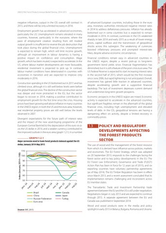 negative influences, output in the CIS overall will contract in 2015, and there will be only a limited recovery in 2016. Employment growth has accelerated in advanced economies, particularly the US. Unemployment remains elevated in many countries, however, particularly in the eurozone, where the pace of employment creation resulting from still modest output growth is insufficient to reverse the job destruction that took place during the global financial crisis. Unemployment is expected to remain high, which will limit income growth, although an improvement in labour dynamics is having a positive impact on confidence and consumption. Wage growth, which has been muted, is expected to accelerate. In the US, where labour market developments are more favourable, residential investment is projected to pick up. In contrast, labour market conditions have deteriorated in countries with economies in transition and are expected to improve only moderately in 2016. Construction spending in the US bottomed out in 2011 and has climbed since, although it is still well below levels seen before the global financial crisis. The decline of the construction sector was deeper and more protracted in the EU, but the sector began to recover in 2014, making a positive contribution to employment growth for the first time since the crisis. Housing prices have been growing well above inflation in many countries in the UNECE region. In both the US and the euro area, however, real residential property prices are still well below the levels observed in 2007. Divergent expectations for the future path of interest rates and the impact of the new asset-buying programme of the European Central Bank led to the depreciation of the euro vis-Ă vis the US dollar in 2014, and a weaker currency contributed to the improved outlook in the euro area (graph 1.2.1). In a number GRAPH 1.2.1 Major currencies used to trade forest products indexed against the US dollar, January 2014-May 2015