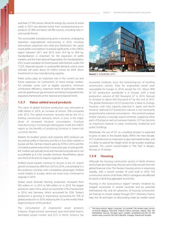 recovered modestly since the bottoming-out of building construction activity. Data for engineered wood were unavailable for Europe in 2014, except for CLT. About 90% of CLT production worldwide is in Europe, with a total production volume of 560 thousand m³ in 2014, forecast to increase to about 630 thousand m³ by the end of 2015. The global distribution of CLT production is likely to change, however, with new capacity planned in Japan and North America. National CLT production volume is not necessarily proportional to national consumption – the central European timber industry is strongly export-oriented, supplying other parts of Europe as well as overseas markets. CLT has become an important material in urban multistorey residential and public buildings. Worldwide, the use of CLT as a building product is expected to grow at rates in the double digits. Within the next decade, CLT could become as important as glue-laminated timber, and it is likely to extend the height limits of tall wooden buildings upwards. The current record-holder is “The Tree” in Bergen, Norway, at 14 storeys.