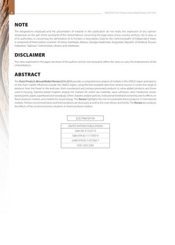 ABSTRACT The Forest Products Annual Market Review 2014-2015 provides a comprehensive analysis of markets in the UNECE region and reports on the main market influences outside the UNECE region, using the best-available data from diverse sources. It covers the range of products from the forest to the end-user: from roundwood and primary-processed products to value-added products and those used in housing. Statistics-based chapters analyse the markets for wood raw materials, sawn softwood, sawn hardwood, woodbased panels, paper, paperboard and woodpulp. Other chapters analyse policies, institutional forestland ownership and its effects on forest products markets, and markets for wood energy. The Review highlights the role of sustainable forest products in international markets. Policies concerning forests and forest products are discussed, as well as the main drivers and trends. The Review also analyses the effects of the current economic situation on forest products markets.