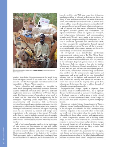 been slow to follow suit. With large proportions of the urban population residing in informal settlements and slums, the ability of local authorities to collect and maintain revenues is low. This renders local authorities unable to provide basic services; address needs of urban citizenry; or plan effectively to accommodate present and future urban growth patterns. Lack of regional and local urban infrastructure hampers sub-regional economic growth and development. Key regional infrastructure deficits in logistics and transport, port infrastructure, information and communications technologies (ICT) and energy, persist to the detriment of efficient storage, transportation of goods and people, etc. The scale of investment required to meet infrastructure deficits and future needs provides a challenge that demands regional and international cooperation. The same will also be necessary to successfully tackle urban resource pressures and threats like climate change and associated natural disasters. At sub-regional scales, infrastructure development programmes and projects, such as the West African Power Pool, are attempting to address key challenges in improving flows and efficiencies within and between cities and countries in the sub-region. Regional agencies such as the African Development Bank are playing a key role in funding infrastructure development. China is also playing a key role in road, rail and port infrastructure development projects. At local scales, infrastructure and technology development plans need to cater for context-specific opportunities and requirements such as the need for low-cost, decentralized solutions that can be deployed and maintained with low levels of skills and training. Such approaches are critical to ensure that services reach the majority urban poor. Bulk infrastructure deployments also need to address the needs of informal settlement and slum dwellers. Inter-generational changes signify a departure from traditional modes of identity construction. This is especially the case for the urban youth as increased levels of migration to developed countries, as well as access to global cultural and identity markers, combine with local cultural changes to produce new, more plural conceptions of personal and group identity. Current and projected climate change impacts in Western Africa take on two broad spatial dimensions. Northern parts of the sub-region, which border the Sahel, are experiencing southward migration of the semi-arid Sahel. To the south and south-west of the region, along the coastal belt, the vulnerability of dense urban corridors and agglomerations to climate change-related pressures such as flooding, storm surges, sea-level rise, saline intrusion and coastal erosion is projected to increase. Temperature and precipitation changes (i.e. seasonal changes as well as changes in frequency and intensity of precipitation events) are likely to make food insecurity a real threat to the sub-region. Conflict and instability also characterize the sub-region, with climate and environmental pressures often increasing religious and ethnic conflicts in the Sahel, placing additional pressures on cities to absorb conflict refugees and internally