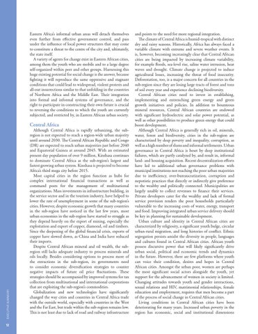 and points to the need for more regional integration. The climate of Central Africa is humid-tropical with distinct dry and rainy seasons. Historically, Africa has always faced a variable climate with extreme and severe weather events. It is, however, becoming increasingly clear that Central African cities are being impacted by increasing climate variability, for example floods, sea-level rise, saline water intrusion, heat waves and drought. Climate change is projected to induce agricultural losses, increasing the threat of food insecurity. Deforestation, too, is a major concern for all countries in the sub-region since they are losing large tracts of forest and tons of soil every year and experience declining biodiversity. Central African cities need to invest in establishing, implementing and entrenching green energy and green growth initiatives and policies. In addition to bounteous mineral resources, Central African countries are endowed with significant hydroelectric and solar power potential, as well as other possibilities to produce green energy that could boost development. Although Central Africa is generally rich in oil, minerals, water, forest and biodiversity, cities in the sub-region are characterized by deep poverty and inequality, corruption, as well as a high number of slums and informal settlements. Urban governance in Central Africa is beset by deep institutional failures, which are partly catalyzed by, and result in, informal land- and housing acquisition. Recent decentralization efforts have led to additional urban governance problems with municipal institutions not reaching the poor urban majorities due to inefficiency, over-bureaucratization, corruption and nepotistic practices that directly or indirectly give preference to the wealthy and politically connected. Municipalities are largely unable to collect revenues to finance their services. Private developers cater for the wealthy and lack of formal service provision renders the poor households particularly vulnerable to the increasing costs of water, energy, transport and food. Improving integrated urban service delivery should be key in planning for sustainable development. Urban culture and identity in Central African cities are characterized by religiosity, a significant youth bulge, circular urban-rural migration, and long histories of conflict. Ethnic segregation persists amidst the diversity in people, languages and cultures found in Central African cities. African youth possess discursive power that will likely significantly drive urban social, political and economic trends and dynamics in the future. However, there are few platforms where youth can voice their condition, desires and hopes in Central African cities. Amongst the urban poor, women are perhaps the most significant social actors alongside the youth, yet support for the advancement of women in society is limited. Changing attitudes towards youth and gender interactions, sexual relations and HIV, matrimonial relationships, female education and employment, requires that men become a part of the process of social change in Central African cities. Living conditions in Central African cities have been deteriorating for many years. Increased urban poverty in the region has economic, social and institutional dimensions
