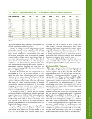 regional urban system of the metropolis, especially when the requisite infrastructure linkages are in place. Likewise, the clustering of people and economic activities, along major logistical arteries (especially roads) radiating from and connecting separate metropolitan areas, leads to the gradual building-up of the urban fabric along these infrastructure connections. Where the metropolitan cores are arranged in a linear fashion, as along coastal or pan-African or other major highways, the outcome will be a ribbon-shaped urban growth pattern (referred to an urban development corridor) that can stretch over long distances. Over time, such urban development corridors will typically also grow in perpendicular directions. Significant new urban nodes can thus come into being, especially where major infrastructure branches off the highway. If multiple metropolitan areas are not positioned in a linear format, as in the case of Gauteng Province in South Africa, the urban fabric will expand and join in multiple directions to form a dense cluster of settlements of all size categories, from metropolises to villages, in a mega urban region (MUR): a vast regional urban system with large to very large population counts. Invariably composed of multiple municipalities, townships and settlements, all these newly emerging concentrations establish urban configurations at regional scales and may have population numbers equivalent to megacities without being referred to as such. The mega-urban region of Gauteng with its aggregate population of well over 12 million is, therefore, a de facto megacity. Likewise, the EMRs of Addis Ababa, Alexandria, Dar es Salaam, Kenitra-El Jadid and Tangier, as well as the transboundary urban system of Kinshasa-Brazzaville, could soon qualify as de facto “megacities” if a wider concept than that dictated by somewhat artificial administrative municipal boundaries is taken into account. Due to their rapidly increasing population and spatial sizes, as well as their large economic significance, agglomerated and regional urban systems are key entry points for the critical directing of Africa’s urban transition towards growth