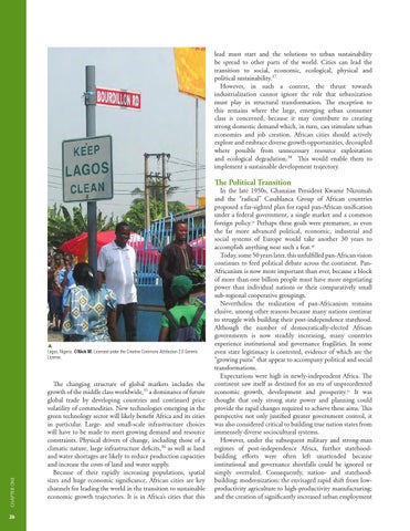 lead must start and the solutions to urban sustainability be spread to other parts of the world. Cities can lead the transition to social, economic, ecological, physical and political sustainability.37 However, in such a context, the thrust towards industrialization cannot ignore the role that urbanization must play in structural transformation. The exception to this remains where the large, emerging urban consumer class is concerned, because it may contribute to creating strong domestic demand which, in turn, can stimulate urban economies and job creation. African cities should actively explore and embrace diverse growth opportunities, decoupled where possible from unnecessary resource exploitation and ecological degradation.38 This would enable them to implement a sustainable development trajectory.