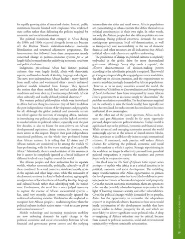intermediate-size cities and small towns. Africa’s populations are concentrating in urban contexts that define themselves as political constituencies in their own right. In other words, not only the African peoples but also African polities are now urbanizing. Rising political awareness; demands for more participatory governance; local self-determination, as well as transparency and accountability in the use of domestic financial and other resources are all indications that Africa’s political values and cultures are rapidly transforming. The promotion of change in political cultures is implicitly embedded in the global drive for more decentralized governance. Although “every ship needs a captain”, the effective deconcentration of decision-making powers according to the subsidiarity principle is required. That would go a long way in providing the engaged governance modalities, the delivery on election promises, and the responsiveness to popular needs increasingly demanded by African populations. However, as in so many countries around the world, the International Guidelines on Decentralization and Strengthening of Local Authorities45 have been interpreted by many African central governments as an excuse simply to “decentralize” the problem-resolution responsibility. The fiscal resources required (or the authority to raise the funds locally) have typically not been decentralized. In such contexts decentralization becomes ineffectual, if not meaningless. At the other end of the power spectrum, Africa needs to unite and pan-Africanism should be far more vigorously pursued, despite inherent political obstacles. Today’s world is a globalized one in the political, economic and financial sense. While advanced and emerging economies around the world increasingly operate in the unison of shared-interest blocks, Africa continues to deal bilaterally in its strategic international relations. If continued, such practice will reduce Africa’s chances for achieving the political, economic and social transformations to which it aspires. Strategic repositioning in the world can no longer be effectively pursued from parochial national perspectives; it requires the numbers and powers found only in cooperative unity. This third issue in The State of African Cities report series attempts to explain why Africa is at a critical junction in its political, economic and social development. The unfolding major transformations offer Africa opportunities to jettison the development trajectories that have failed to deliver its postindependence visions of human development and prosperity. Given the present economic momentum, there are options to reflect on the desirable urban development trajectories in the light of looming resources scarcity and other vulnerabilities. Given the political changes widely demanded by its peoples, Africa has the opportunity to reconsider the adaptations required in its political cultures. Inaction in these areas would imply perpetuation of the development models that have proven unable to deliver prosperity for all, and which are more likely to deliver significant socio-political risks. A deep re-imagining of African urbanism may be critical, because there cannot be political, economic, social and environmental sustainability without sustainable urbanization.