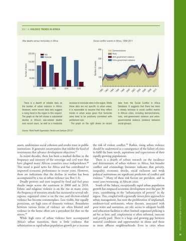 assets, undermines social cohesion and erodes trust in public institutions. It generates uncertainties that inhibit the kind of investments that advance development objectives.47 In recent decades, there has been a marked decline in the frequency and intensity of the sovereign and civil wars that have plagued many African countries since independence.48 This trend is good news for Africa and has contributed to improved economic performance in recent years. However, there are indications that the decline in warfare has been accompanied by a rise in urban violence (see Box 1.4). Deadly protests and riots inspired by food and fuel price shocks swept across the continent in 2008 and in 2010. Ethnic and religious violence is on the rise in many cities; the frequency of terrorists attacks has increased in several subregions; organized crime is on the rise; and election-related violence has become commonplace. Less visible, but equally pernicious, are high rates of domestic violence. Boundaries between various forms of violence are often blurred and violence in the home often sets a precedent for that on the streets.49 While high rates of urban violence have accompanied Africa’s urban transition, there is little evidence that urbanization or rapid urban population growth per se increase
