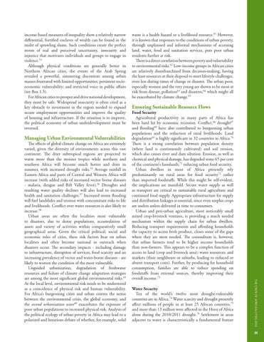 waste is a health hazard or a livelihood resource.61 However, it is known that responses to the conditions of urban poverty, through unplanned and informal mechanisms of accessing land, water, food and sanitation services, puts poor urban residents further at risk. There is a direct correlation between poverty and vulnerability to environmental risks.62 Low-income groups in African cities are relatively disenfranchised from decision-making, having the least resources at their disposal to meet lifestyle challenges, even less during times of change or disaster. The urban poor, especially women and the very young are shown to be most at risk from disease, pollution63 and disasters,64 which might all be exacerbated by climate change.65