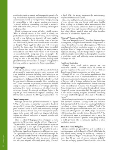 in South Africa has already implemented a waste-to-energy project at its Mariannhill Landfill. Almost invariably, informal settlements and communities of waste pickers arise near formal solid waste landfills. Waste recycling can be lucrative where waste emanates from middle to upper income settlements. But waste-pickers live dangerously, with a high incidence of injuries and infection from sharp objects, medical waste and other hazardous substances in uncontrolled disposal sites. “External” Threats and Shocks There have been predictions of 200 million climate refugees (eco-migrants), with global environmental change viewed as a major driver of renewed rural-urban migrations.83 However, natural growth of urban populations appears to be a far more significant driver of change and vulnerability in Africa than migration, including climate change induced migration.84 Understanding the nature of urban demographics is essential to predicting trends and addressing urban environmental challenges and risks. Health and Sanitation Although recent trends indicate progress and even acceleration towards a healthier Africa, of concern are apparent inequities in the access to basic services which are skewed towards high-income groups and urban areas. Although 42 per cent of the urban population of SubSaharan Africa has access to improved sanitation, low access levels in urban informal settlements can lead to higher risks of diseases. Lack of drainage and piped sewage do increase urban habitats for the anopheles mosquito, thereby increasing vector risk and spread of malaria even during dry seasons.85 Rising temperatures and flooding through global climate change will increase, or certainly shift, the range and spread of the malaria-carrying mosquito potentially threatening previously unaffected highland cities such as Nairobi and Harare.86 Human health contributes to the indices used to determine least developed countries. Existing health and sanitation challenges (particularly those in urban areas) might be further exacerbated by climate change and variability.87 South of the Sahara, only Madagascar and Malawi are on track to reach the Millennium Development Goal (MDG) target (see also Box 1.10) to reduce child mortality by two-thirds in 2015.88 The lack of equitable access to resources and services across the board in African countries89 provides an on-going challenge to health provision. This is particularly significant as urban populations increase. Adaptation versus Mitigation African countries are generally low-level contributors to greenhouse gases, with the Republic of South Africa being the only African country among the world’s top 25 emitters of carbon dioxide over the past several decades.90 Cities generate more than 80 per cent of carbon emissions globally.91 Countries are largely governed from their cities, which also