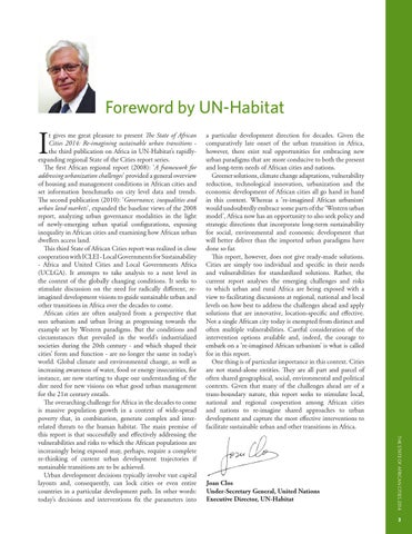 t gives me great pleasure to present The State of African Cities 2014: Re-imagining sustainable urban transitions the third publication on Africa in UN-Habitat’s rapidlyexpanding regional State of the Cities report series. The first African regional report (2008): ‘A framework for addressing urbanization challenges’ provided a general overview of housing and management conditions in African cities and set information benchmarks on city level data and trends. The second publication (2010): ‘Governance, inequalities and urban land markets’, expanded the baseline views of the 2008 report, analyzing urban governance modalities in the light of newly-emerging urban spatial configurations, exposing inequality in African cities and examining how African urban dwellers access land. This third State of African Cities report was realized in close cooperation with ICLEI - Local Governments for Sustainability - Africa and United Cities and Local Governments Africa (UCLGA). It attempts to take analysis to a next level in the context of the globally changing conditions. It seeks to stimulate discussion on the need for radically different, reimagined development visions to guide sustainable urban and other transitions in Africa over the decades to come. African cities are often analyzed from a perspective that sees urbanism and urban living as progressing towards the example set by Western paradigms. But the conditions and circumstances that prevailed in the world’s industrialized societies during the 20th century - and which shaped their cities’ form and function - are no longer the same in today’s world. Global climate and environmental change, as well as increasing awareness of water, food or energy insecurities, for instance, are now starting to shape our understanding of the dire need for new visions on what good urban management for the 21st century entails. The overarching challenge for Africa in the decades to come is massive population growth in a context of wide-spread poverty that, in combination, generate complex and interrelated threats to the human habitat. The main premise of this report is that successfully and effectively addressing the vulnerabilities and risks to which the African populations are increasingly being exposed may, perhaps, require a complete re-thinking of current urban development trajectories if sustainable transitions are to be achieved. Urban development decisions typically involve vast capital layouts and, consequently, can lock cities or even entire countries in a particular development path. In other words: today’s decisions and interventions fix the parameters into