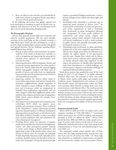 requires sociocultural bridging mechanisms, so that a broader dialogue ensues within cities about rights and identity • Developing youth citizenship is a necessary step in improving youth inclusion in African cities111 by increasing the membership of youth into grassroots, civil society organizations as well as facilitating their involvement in urban development planning and management. To foster youth inclusion in communities and urban society, prepare and implement policies which stimulate youth-oriented civil society mobilization as well as youth inclusion in public, private, and especially joint public-private development initiatives in cities • Stimulating youth involvement in urban agriculture, perhaps one of the most neglected opportunities in African cities, largely practised by the informal sector without the explicit support of city governments and the state. Despite their critical role in African urban food security, informal urban agriculturalists are mostly tolerated rather than supported. In this respect, the protection of valuable urban agricultural lands from encroachment is a linked challenge, one which requires a response to the broader challenges of unplanned informal settlement growth. Youth-driven protests that sparked the onset of the Arab Spring (see Box 1.5 and Chapter 2) in highly urbanized Northern Africa have the potential to move into south of Sahara, where similar youth bulges and unequal social conditions persist. Marginalization and exclusion of youth from broader society and opportunities within the urban socio-economic fabric threaten to bring about even more severe reactions in sub-Saharan Africa. The youth are pivotal to sociocultural and economic change in Africa. Direct and inclusive measures are necessary to harness this role to realize the most beneficial outcomes to society, including the manner in which the future of urban African societies unfolds. This has potential to contribute positively if guided appropriately. If not, the consequences for stability in African cities may be dire.