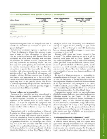 attract port business from Johannesburg provided Maputo’s capacity and support for trade, industry and port activity improves. In the near future, it is conceivable that tourism between Johannesburg and Maputo might be restored to, or even surpass, its former level. Through mobile phone use, Internet connectivity has increased.128 The mobile revolution has played a role in governing urban slums such as Kibera (Nairobi)129 and may eventually spread to a range of other sectors including health, agriculture, energy and education. Identified trends, which are predicted to fuel new business growth, include geolocation and mobile money; for example, money transfers and microcredit schemes. These allow for better monitoring and securitization of assets at lower data costs and improved reliability.130 The growth of Africa’s energy sector is a prerequisite for sustained expansion in all others. Large energy projects have included the development of the Inga hydroelectric dam on the Congo River; the Desertec consortium-led establishment of 100 large concentrated solar power plants in the Sahara; wind farms in South Africa, Namibia and the Rift Valley; and the continued development of the fossil fuel sectors in Central and Western Africa, and the Republic of South Africa. Investment in renewable energies and green technologies globally has surpassed all other conventional and emerging technology sectors (see also Chapter 1.1). The green technology revolution is likely to be the next global industrial transition.131 Africa and Asia constitute the largest clients for these new services, as demand for energy- and resourceefficient technologies will be huge in their rapidly growing and expanding cities. Yet the question of whether all new technologies can successfully take root in developing African cities remains open since affordability and appropriateness have not been adequately assessed.