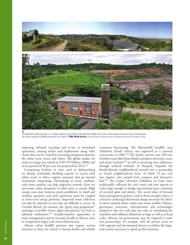 ecosystem functioning. The Mariannhill Landfill, near eThekwini (South Africa), was registered as a national conservancy in 2002.163 The facility receives over 450 tons of urban waste daily from which it produces electricity, treats and reuses leachates164 as well as extracting toxic substances through artificial wetlands. In Kampala (Uganda) the Kasubi-Kawala neighbourhood entered into a partnership to recycle neighbourhood waste, of which 75 per cent was organic, into animal feed, compost and alternative fuel.165 The Coptic Christian Zabbaleen in Cairo have traditionally collected the city’s waste and now operate at scales large enough to bridge international price variations of recycled glass and plastic. The social value of focused waste management projects, such as these examples above, is critical to catalysing behavioural change necessary for Africa to move towards future urban zero-waste profiles. Policies, governance structures, infrastructures and technologies adopted at the city scale play key roles in stimulating the transition and influence behaviour at large as well as at local scales. African city governments may be required to enter into partnerships, for example, with the private sector or with regional and international donors to achieve the largescale actions necessary to speed up the transition.