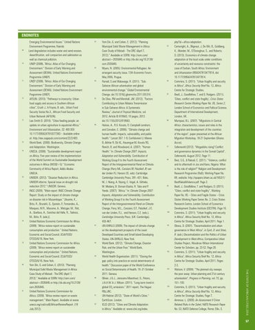 Endnotes Emerging Environmental Issues.” United Nations Environment Programme, Nairobi. 69 Land degradation includes water and wind erosion, desertification, soil compaction and salinization as well as chemical pollution. 70 UNEP (2008), “Africa: Atlas of Our Changing Environment.” Division of Early Warning and Assessment (DEWA). United Nations Environment Programme (UNEP). 71 UNEP (2008), “Africa: Atlas of Our Changing Environment.” Division of Early Warning and Assessment (DEWA). United Nations Environment Programme (UNEP). 72 AFSUN. (2010). “Pathways to insecurity: Urban food supply and access in Southern African cities”, Crush J., & Frayne, B. eds., Urban Food Security Series No.3., African Food Security and Urban Network (AFSUN). 73 Lee-Smith D. (2010). “Cities feeding people: an update on urban agriculture in equatorial Africa.” Environment and Urbanization, 22: 483 DOI: 10.1177/0956247810377383 – Available online at: http://eau.sagepub.com/content/22/2/483.