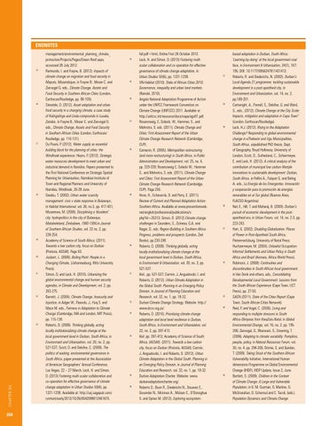 full.pdf+html, Online First 26 October 2012. Leck, H. and Simon, D. (2013) Fostering multiscalar collaboration and co-operation for effective governance of climate change adaptation, in Urban Studies 50(6), pp. 1221-1238. 45 UN-Habitat (2010). State of African Cities 2010; Governance, inequality and urban land markets. (Nairobi, 2010). 46 Angola National Adaptation Programme of Action under the UNFCC Framework Convention on Climate Change (UNFCCC) 2011. Available at http://unfccc.int/resource/docs/napa/ago01.pdf. 47 Rosenzweig, C, Solecki, W., Hammer, S., and Mehrotra, S. eds. (2011). Climate Change and Cities: First Assessment Report of the Urban Climate Change Research Network (Cambridge, CUP). 48 Cameron, R. (2005). Metropolitan restructuring (and more restructuring) in South Africa, in Public Administration and Development, vol. 25, no. 4, pp. 329-339; Rosenzweig C, Solecki W., Hammer S., and Mehrotra, S. eds. (2011). Climate Change and Cities: First Assessment Report of the Urban Climate Change Research Network (Cambridge, CUP). Page 255. 49 Hove, H., Echeverría, D. and Parry, E. (2011). Review of Current and Planned Adaptation Action: Southern Africa. Available at www.preventionweb. net/english/professional/publications/v. php?id=25313; Simon, D. (2012) Climate change challenges in Saunders, S., Dzinesa, G.A. and Nagar, D., eds. Region-Building in Southern Africa: Progress, problems and prospects (London, Zed Books), pp.230-248. 50 Roberts, D. (2008). Thinking globally, acting locally-institutionalizing climate change at the local government level in Durban, South Africa, in Environment & Urbanization, vol. 20, no. 2, pp. 521-537. 51 Ibid., pp. 521-537; Carmin, J, Anguelovski, I. and Roberts, D. (2012). Urban Climate Adaptation in the Global South: Planning in an Emerging Policy Domain, in Journal of Planning Education and Research, vol. 32, no. 1, pp. 18-32. 52 Durban Climate Change Strategy. Website: http:// www.dccs.org.za/. 53 Roberts, D. (2010). Prioritizing climate change adaptation and local level resilience in Durban, South Africa, in Environment and Urbanization, vol. 22, no. 2, pp. 397-413. 54 Ibid. pp. 397-413; Academy of Science of South Africa. (ASSAf). (2011). Towards a low carbon city, focus on Durban (Pretoria, ASSAf); Carmin, J, Anguelovski, I. and Roberts, D. (2012). Urban Climate Adaptation in the Global South: Planning in an Emerging Policy Domain, in Journal of Planning Education and Research, vol. 32, no. 1, pp. 18-32.