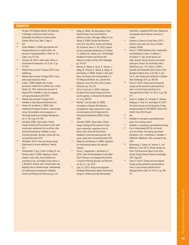 Endnotes the Age of the Marginal Majority: An Exploration of Strategies to Overcome Youth Exclusion, Vulnerability and Violence in Southern Africa, Southern Africa Trust. Table 1; Page 21. 159 Ibid. 160 Leclerc-Madlala, S. (2008). Age-disparate and intergenerational sex in southern Africa: the dynamics of hypervulnerability, in AIDS, vol. 22, Suppl. 4, pp. 517-525. 161 Sommers, M. (2010). Urban youth in Africa, in Environment & Urbanisation, vol. 22, No. 2, pp. 317-332. 162 Website (last accessed 15 August 2013): www. abahlali.org. 163 Website (last accessed 15 August 2013): www. sdine.org/country/south-africa/. 164 Lindell, I. (2008). Multiple sites of urban governance: insights from an African city, in Urban Studies; 45; 1879, website (last accessed 15 August 2013): Available at: http://usj.sagepub. com/cgi/content/abstract/45/1879. 165 Website (last accessed 15 August 2013): Available at: http://africancentreforcities.net/ 166 Hodson, M. and Marvin, S. (2009). Cities mediating technological transitions: understanding visions, intermediation and consequences, in Technology Analysis and Strategic Management, vol. 21, No. 4, pp. 515–534. 167 ActionAid. (2006). Unjust waters: Climate change, flooding and the protection of poor urban communities: experiences from six African cities, Action Aid International. Available at: www. actionaid.org.uk/doc_lib/unjust_waters.pdf, Last accessed November 2010. 168 UN-Habitat. (2011). Cities and climate change: Global report on human settlements. Nairobi, 2011. 168 Satterthwaite, D, Huq, S, Reid, H, Pelling, M. and Romero Lankao, P. (2009). Adapting to climate change in urban areas: the possibilities and constraints in low- and middle-income nations, in J. Bicknell, D. Dodman and D. Satterthwaite, eds., Adapting Cities to Climate Change: Understanding and addressing the development challenges (London and Sterling, VA, Earthscan), pp. 3-47.