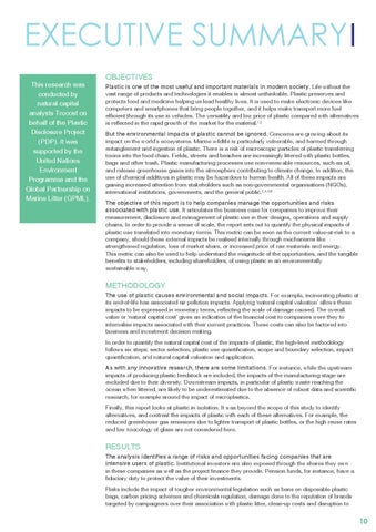 OBJECTIVES Plastic is one of the most useful and important materials in modern society. Life without the vast range of products and technologies it enables is almost unthinkable. Plastic preserves and protects food and medicine helping us lead healthy lives. It is used to make electronic devices like computers and smartphones that bring people together, and it helps make transport more fuel efficient through its use in vehicles. The versatility and low price of plastic compared with alternatives is reflected in the rapid growth of the market for the material.1,2 But the environmental impacts of plastic cannot be ignored. Concerns are growing about its impact on the world’s ecosystems. Marine wildlife is particularly vulnerable, and harmed through entanglement and ingestion of plastic. There is a risk of microscopic particles of plastic transferring toxins into the food chain. Fields, streets and beaches are increasingly littered with plastic bottles, bags and other trash. Plastic manufacturing processes use non-renewable resources, such as oil, and release greenhouse gases into the atmosphere contributing to climate change. In addition, the use of chemical additives in plastic may be hazardous to human health. All of these impacts are gaining increased attention from stakeholders such as non-governmental organisations (NGOs), international institutions, governments, and the general public.3,4,5,6 The objective of this report is to help companies manage the opportunities and risks associated with plastic use. It articulates the business case for companies to improve their measurement, disclosure and management of plastic use in their designs, operations and supply chains. In order to provide a sense of scale, the report sets out to quantify the physical impacts of plastic use translated into monetary terms. This metric can be seen as the current value-at-risk to a company, should these external impacts be realised internally through mechanisms like strengthened regulation, loss of market share, or increased price of raw materials and energy. This metric can also be used to help understand the magnitude of the opportunities, and the tangible benefits to stakeholders, including shareholders, of using plastic in an environmentally sustainable way.
