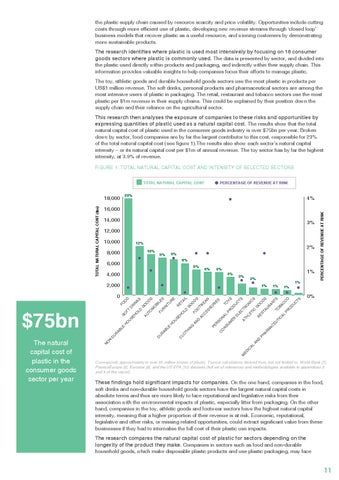 the plastic supply chain caused by resource scarcity and price volatility. Opportunities include cutting costs through more efficient use of plastic, developing new revenue streams through ‘closed loop’ business models that recover plastic as a useful resource, and winning customers by demonstrating more sustainable products. The research identifies where plastic is used most intensively by focusing on 16 consumer goods sectors where plastic is commonly used. The data is presented by sector, and divided into the plastic used directly within products and packaging, and indirectly within their supply chain. This information provides valuable insights to help companies focus their efforts to manage plastic. The toy, athletic goods and durable household goods sectors use the most plastic in products per US$1 million revenue. The soft drinks, personal products and pharmaceutical sectors are among the most intensive users of plastic in packaging. The retail, restaurant and tobacco sectors use the most plastic per $1m revenue in their supply chains. This could be explained by their position down the supply chain and their reliance on the agricultural sector. This research then analyses the exposure of companies to these risks and opportunities by expressing quantities of plastic used as a natural capital cost. The results show that the total natural capital cost of plastic used in the consumer goods industry is over $75bn per year. Broken down by sector, food companies are by far the largest contributor to this cost, responsible for 23% of the total natural capital cost (see figure 1).The results also show each sector’s natural capital intensity – or its natural capital cost per $1m of annual revenue. The toy sector has by far the highest intensity, at 3.9% of revenue. Figure 1: Total natural capital cost and intensity of selected sectors TOTAL NATURAL CAPITAL COST