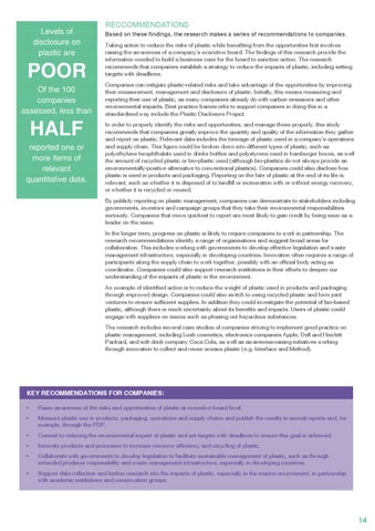 RECCOMMENDATIONS Based on these findings, the research makes a series of recommendations to companies. Taking action to reduce the risks of plastic while benefiting from the opportunities first involves raising the awareness of a company’s executive board. The findings of this research provide the information needed to build a business case for the board to sanction action. The research recommends that companies establish a strategy to reduce the impacts of plastic, including setting targets with deadlines. Companies can mitigate plastic-related risks and take advantage of the opportunities by improving their measurement, management and disclosure of plastic. Initially, this means measuring and reporting their use of plastic, as many companies already do with carbon emissions and other environmental impacts. Best practice frameworks to support companies in doing this in a standardised way include the Plastic Disclosure Project. In order to properly identify the risks and opportunities, and manage these properly, this study recommends that companies greatly improve the quantity and quality of the information they gather and report on plastic. Relevant data includes the tonnage of plastic used in a company’s operations and supply chain. This figure could be broken down into different types of plastic, such as polyethylene terephthalate used in drinks bottles and polystyrene used in hamburger boxes, as well the amount of recycled plastic or bio-plastic used (although bio-plastics do not always provide an environmentally-positive alternative to conventional plastics). Companies could also disclose how plastic is used in products and packaging. Reporting on the fate of plastic at the end of its life is relevant, such as whether it is disposed of to landfill or incineration with or without energy recovery, or whether it is recycled or reused. By publicly reporting on plastic management, companies can demonstrate to stakeholders including governments, investors and campaign groups that they take their environmental responsibilities seriously. Companies that move quickest to report are most likely to gain credit by being seen as a leader on the issue. In the longer term, progress on plastic is likely to require companies to work in partnership. The research recommendations identify a range of organisations and suggest broad areas for collaboration. This includes working with governments to develop effective legislation and waste management infrastructure, especially in developing countries. Innovation often requires a range of participants along the supply chain to work together, possibly with an official body acting as coordinator. Companies could also support research institutions in their efforts to deepen our understanding of the impacts of plastic in the environment. An example of identified action is to reduce the weight of plastic used in products and packaging through improved design. Companies could also switch to using recycled plastic and form joint ventures to ensure sufficient supplies. In addition they could investigate the potential of bio-based plastic, although there is much uncertainty about its benefits and impacts. Users of plastic could engage with suppliers on issues such as phasing out hazardous substances. The research includes several case studies of companies striving to implement good practice on plastic management, including Lush cosmetics, electronics companies Apple, Dell and Hewlett Packard, and soft drink company Coca Cola, as well as awareness-raising initiatives working through innovation to collect and reuse oceans plastic (e.g. Interface and Method).