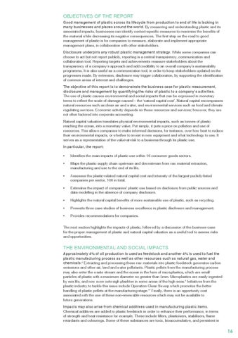 objectives of the report Good management of plastic across its lifecycle from production to end of life is lacking in many businesses and places around the world. By measuring and understanding plastic and its associated impacts, businesses can identify context-specific measures to maximise the benefits of the material while decreasing its negative consequences. The first step on the road to good management of plastic is for companies to measure, elaborate and implement appropriate management plans, in collaboration with other stakeholders. Disclosure underpins any robust plastic management strategy. While some companies can choose to act but not report publicly, reporting is a central transparency, communication and collaboration tool. Reporting targets and achievements reassure stakeholders about the transparency of a company’s approach and add credibility to an overall company’s sustainability programme. It is also useful as a communication tool, in order to keep stakeholders updated on the progresses made. By extension, disclosure may trigger collaboration, by supporting the identification of common areas of interest and challenges. The objective of this report is to demonstrate the business case for plastic measurement, disclosure and management by quantifying the risks of plastic to a company’s activities. The use of plastic causes environmental and social impacts that can be expressed in monetary terms to reflect the scale of damage caused – the ‘natural capital cost’. Natural capital encompasses natural resources such as clean air and water, and environmental services such as food and climate regulating services. Economic activity depends on these resources and services; however, they are not often factored into corporate accounting. Natural capital valuation translates physical environmental impacts, such as tonnes of plastic reaching the ocean, into a monetary value. Put simply, it puts a price on pollution and use of resources. This allows companies to make informed decisions, for instance, over how best to reduce their environmental impacts, or whether to invest in new equipment and what technology to use. It serves as a representation of the value-at-risk to a business through its plastic use. In particular, the report: •