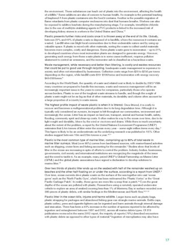 the environment. These substances can leach out of plastic into the environment, affecting the health of wildflife.2 Some additives are also of concern to human health. An example is the potential leaching of bisphenol A from plastic containers into the food it contains. Another is the possible migration of flame retardants from plastic computer enclosures into dust that humans breathe. Workers can also be exposed to additive leachate during the manufacturing stage. For example, trimethlytin chloride due to the use of methlytin stabilising agents in PVC products is linked to the increased risk of developing kidney stones in workers in the United States and China.15 Plastic presents further risks and costs once it is thrown away at the end of its life. Globally, between 22% and 43% of plastic waste is disposed of in landfills, where the resources it contains are wasted. Landfill sites can blight local communities due to their undesirable nature and by using up valuable space. If plastic is mixed with other materials, sorting the waste to collect useful materials becomes more complex, costly and dangerous. Some plastic waste goes to incineration – up to 21% in developed countries where most incineration plants are designed to generate energy. However, generating such energy from these waste plants is in some cases inefficient, requires pollution abatement to control air emissions, and the incinerator ash is classified as a hazardous waste. Waste management, while necessary and better than littering, is costly and wastes resources that could be put to good use through recycling. Inadequate waste management is expensive to society and often not internalised by businesses. Collection costs range from $20 to $250 per tonne depending on the region, while landfill costs $10- $100/tonne and incineration with energy recovery $40-200/tonne.8 According to the World Bank, the quantity of waste and related cost is likely to double by 2025.8 With many countries un-prepared to handle this increase, waste and resource management will be an increasingly important issue in the years to come for companies, particularly those who operate across borders. Plastic is one of the toughest waste streams to handle, and though the weight of plastic waste might not be as big as that of other materials, its durability and volume often account for a large proportion of a country’s waste issues. The highest profile impact of waste plastic is when it is littered. Once littered, it is costly to recover and becomes a multigenerational problem due to its long degradation time. Although it is typically only considered an eyesore, its impact is felt throughout our communities, environment and increasingly the ocean. Litter has an impact on land use, transport, animal and human health, safety, flooding, community spirit and clean-up costs. It often makes its way to the ocean over time, due to its light weight and durability, blown by the wind or via rivers and drains. While there is much uncertainty about the extent of the problem, a report by the United Nations Environment Programme (UNEP) estimates that 6.4m tonnes of litter enter the ocean every year – some eight million items every day.5 This figure is likely to be an underestimate as the underlying research was published in 1975. Other studies suggest between 10m and 20m tonnes a year.16,17 Plastic is the most common type of marine litter, comprising up to 80% of total waste in marine litter surveys. Most (over 80%) comes from land-based sources, with marine-based activities such as shipping, cruise lines and fishing accounting for the remainder.5 Studies show that levels of litter in the ocean are increasing in spite of efforts to control the problem. Industry bodies, businesses, governments, civil society and international institutions are recognizing the magnitude of the issue and the need to tackle it. As an example, many joined UNEP’s Global Partnership on Marine Litter (GPML) and the global plastic associations have signed a declaration to develop solutions to marine litter.18 Over two thirds of plastic litter ends up on the seabed with half of the remainder washed up on beaches and the other half floating on or under the surface, according to a report from UNEP.5 Over time, ocean currents drive plastic waste on the surface of the sea together into vast ‘ocean gyres’ such as the ‘North Pacific Gyre’, which has been nicknamed the ‘Plastic Vortex’ or the ‘Great Pacific Garbage Patch’. In reality, these gyres are more like a soup than a patch.19 Even the great depths of the ocean are polluted with plastic. Researchers using a remotely operated underwater vehicle to explore an area of seabed covering less than 1% of Monterey Bay in surface recorded over 380 pieces of plastic debris, with similar findings in the Mediterranean and North Sea.20,21,22 Plastic litter in the ocean kills, injures and harms wildlife. Larger items such as plastic bags, plastic strapping for packages and abandoned fishing gear can strangle marine animals. Bottle caps, plastic cutlery, pens and cigarette lighters can be ingested and harm animals through internal damage and starvation. There has been a 40% increase in the number of species reported to be affected by ingestion and entanglement between 1997 and 2012, across all marine debris types. Of 319 publications reviewed in the same 2012 report, the majority of reports (76%) described encounters with plastic debris as opposed to other types of material.6 Ingestion of microplastics may also have