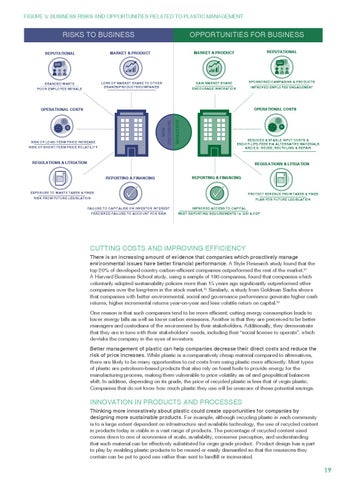 CUTTING COSTS AND IMPROVING EFFICIENCY There is an increasing amount of evidence that companies which proactively manage environmental issues have better financial performance. A Style Research study found that the top 20% of developed country carbon-efficient companies outperformed the rest of the market.31 A Harvard Business School study, using a sample of 180 companies, found that companies which voluntarily adopted sustainability policies more than 15 years ago significantly outperformed other companies over the long-term in the stock market.32 Similarly, a study from Goldman Sachs shows that companies with better environmental, social and governance performance generate higher cash returns, higher incremental returns year-on-year and less volatile return on capital.33 One reason is that such companies tend to be more efficient; cutting energy consumption leads to lower energy bills as well as lower carbon emissions. Another is that they are perceived to be better managers and custodians of the environment by their stakeholders. Additionally, they demonstrate that they are in tune with their stakeholders’ needs, including their “social license to operate”, which de-risks the company in the eyes of investors. Better management of plastic can help companies decrease their direct costs and reduce the risk of price increases. While plastic is a comparatively cheap material compared to alternatives, there are likely to be many opportunities to cut costs from using plastic more efficiently. Most types of plastic are petroleum-based products that also rely on fossil fuels to provide energy for the manufacturing process, making them vulnerable to price volatility as oil and geopolitical balances shift. In addition, depending on its grade, the price of recycled plastic is less that of virgin plastic. Companies that do not know how much plastic they use will be unaware of these potential savings.