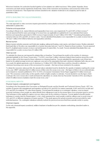 STEP 2: BUILDING THE VALUATION MODEL ECONOMIC IMPACTS The main approach to value economic impacts generated by marine plastics is based on calculating the yearly revenue loss attributable to plastic litter. Fisheries and aquaculture According to Mouat et al., marine fisheries and aquaculture lose every year respectively 2% and 0.03% of their revenue.28 Trucost assumed that the same percentage of revenue loss was applicable at a global level. It was estimated that marine fisheries and aquaculture generated in 2009 revenue of approximately 52 and 1 billion 2012 US$.194 Considering that plastics comprise between 50% and 80% of marine waste, Trucost calculated that plastics were responsible for a yearly revenue loss of 794 and 7 million 2012 US$ for fisheries and aquaculture activities. Marine tourism Marine tourism includes seawater and freshwater angling, sailing and boating, water sports, and inland cruises. Studies estimated that beach litter in Sweden was responsible for a tourism decrease between 1 and 5%. Based on these numbers, Trucost assumed that 3% of global marine tourism revenue was lost because of marine litter. As result, Trucost calculated that plastic litter was responsible for a yearly revenue loss of 4 million US$. Clean-up cost To calculate the clean-up cost imposed by plastics litter on beaches, Trucost based its model on the number of volunteers estimated globally by the Ocean Conservancy.120 In 2012, more than 5 million volunteers helped clean beaches around the world. To put a value on the time spent by these volunteers on cleaning beaches, Trucost calculated the opportunity cost of their time, based on the global average income per capita per year and on the assumption that each volunteers dedicates half a day per year. As a result, the global opportunity cost of volunteers is 74 billion 2012 US$. While there could be a benefit to collection – volunteers becoming more aware of the environment for example – this has not been included in the analysis. To obtain the economic values per kilo, the annual values calculated must be divided by the quantity of plastics reaching the ocean every year. UNEP estimates that 6.4 million tonnes of litter enter the ocean every year – this figure is likely to be an underestimate, as it is based on research published in 1975.5 In 2013, a European Commission Green Paper suggested 10 million tonnes per year.16 No consensus exists today on this quantity which is highly complex to estimate. Trucost decided to use the figure which would give the more conservative result and based its calculation on a study done by Raveender Vannela in 2012, according to which 20 million tonnes of plastics reach the ocean every year.17 ECOLOGICAL IMPACTS Physical impacts: entanglement and ingestion According to the Secretariat of the Convention on Biological Diversity and the Scientifc and Technical Advisory Panel—GEF, the number of species with entanglement and ingestion records is 45% and 26% for marine mammals, 0.39% and 0.24% for fish and 21% and 28% for seabirds.6 To value these impacts, Trucost based its analysis on a contingent valuation, a survey-based economic technique where people are asked directly their willingness to pay for the preservation of an ecosystem good or service. This technique is often applied to capture non-use values such as the existence of species. Trucost applied a benefit transfer technique to a study done by Ressurreição A. et al., which assessed how much people would be willing to pay to avoid a loss of 10% and 25% of different categories of marine species.195 This study ignores the actual ecosystem services provided by each individual species. Yet, contingent valuations indirectly include the perceived services that these animals render to society. Chemical impacts As the only chemical impact considered, additive leachate is handled as per the valuation methodology described earlier in this appendix.