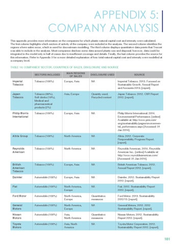 APPENDIX 5: company analysis This appendix provides more information on the companies for which plastic natural capital cost and intensity were calculated. The first column highlights which sectors of activity of the company were included in the analysis. The second column identifies the regions where sales occur, which is used for downstream modelling. The third column displays quantitative data points that Trucost was able to include in the analysis. Most companies disclose some data around plastic use and disposal; however, data could be integrated in the model only in half of cases due to insufficient coverage and details. Finally, the last column provides the source for this information. Refer to Appendix 3 for a more detailed explanation of how total natural capital cost and intensity were modelled at a company level. TABLE 16: COMPANIES’ SECTOR, COUNTRIES OF SALES, DISCLOSURE AND SOURCE Sectors included