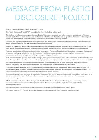 message from plastic disclosure project Andrew Russell, Director, Plastic Disclosure Project The Plastic Disclosure Project (PDP) is delighted to share the findings in this report. The findings reveal concerning impacts to natural capital stemming from plastic use in the consumer goods industry. The true impacts are likely to be much more severe, as the report calculates only those that can be quantified. As science catches up with plastic use, the magnitude of impacts omitted or conservatively assessed will surely increase. Moreover, this report highlights the risks and opportunities that plastic poses to business. The objective is to help companies respond to these challenges and become more sustainable businesses. There is an opportunity at hand for businesses to act before legislators, consumers, investors, and community and activist NGOs force action, eroding business value. Sustainable use of plastic, as with many other resources, makes good business sense. Business opportunities will be unique from company to company. Reviewing how plastic and its waste are managed; the design of products or packaging, including its recycled content or recyclability; and reducing the impacts of plastic on operations, communities and society at large, can unlock previously unrecognised benefits. Such benefits are often good for business, for example, saving input costs and recovering value from waste; customer loyalty, such as preferred products and enhanced brand value; employee engagement; community satisfaction, and improved access to capital. The failure of a business to consider these benefits and/or to demonstrate action on these issues may bring about negative impacts. Regulatory risk, reputational damage and loss of competitive advantage are all very real threats. Companies in plastic intensive sectors theoretically have the most value-at-risk, and greatest opportunities ahead of them. Yet all companies are in a position to mitigate risks and seize opportunities in relation to proactive plastic management. Indeed, PDP recommends that all organisations measure and manage their ‘plastic footprint’. Disclosure is an important step towards sustainable plastic use. This can be accomplished through a standalone declaration, or as part of a sustainability report. Such action demonstrates an organisation’s commitment to the issue and demonstrating year-on-year progress. Whether a company chooses to formally sign on to the Plastic Disclosure Project, or follow its guidance informally, we ask companies to become more aware of their plastic footprint. Measure it, consider the implications and explore better management practices. We hope this report is a clarion call for action on plastic, and that it compels organisations to take action. We wish to thank UNEP, Trucost, all the contributors and reviewers, and the Oak Foundation for their support.