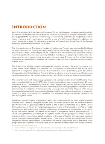 Introduction At its first session, the United Nations Permanent Forum on Indigenous Issues requested the United Nations System produce such a report on the state of the world’s indigenous peoples.2 It was also suggested the report be a key advocacy tool for raising awareness on indigenous peoples’ issues in general and in particular to raise the profile of the Permanent Forum. In addition, the report should be of value for deliberations within the Economic and Social Council, the General Assembly and other bodies of the UN system. The first publication of The State of the World’s Indigenous Peoples was published in 2009 and its major focus was on: Poverty and Well-being; Culture; Environment; Contemporary Education; Health; Human Rights and Emerging Issues. The report was well received, and, according to press reports, the publication revealed alarming statistics on indigenous peoples’ poverty, health, education, employment, human rights, the environment and more. This was the first United Nations publication and provided much needed information on the status of indigenous peoples throughout the world. The State of the World’s Indigenous Peoples will remain a recurrent “flagship” publication produced by the United Nations. It is intended that publications such as this will deal with a broad spectrum of indigenous peoples’ issues. It is hoped that such a publication, given its function of supporting the United Nations Permanent Forum, will also promote awareness of indigenous peoples’ issues within the United Nations system, with States, academia and the broader public. The current situation of indigenous peoples remains a concern within the United Nations. It has been estimated that the world’s 370 million indigenous peoples reside in approximately 90 countries of the world.3 They are among the world’s most marginalized peoples, and are often isolated politically and socially within the countries where they reside by the geographical location of their communities, their separate histories, cultures, languages and traditions. They are often among the poorest peoples and the poverty gap between indigenous and non-indigenous groups is increasing in many countries around the world. This influences indigenous peoples’ quality of life and their right to health. Indigenous peoples’ access to adequate health care remains one of the most challenging and complex areas. There is an urgent need to focus on health issues as well as alternative health care frameworks. As previously stated, health is one of the six mandated areas of the United Nations Permanent Forum on Indigenous Issues and is one of the focuses of the World Health Organization, which recognizes the right to health as a fundamental human right in its constitution. The United Nations Declaration on the Rights of Indigenous Peoples includes articles (21, 23, 24 and 29) that refer specifically to the right to health, including indigenous peoples’ right to improving their economic and social conditions in the area of health, with particular attention to the needs of indigenous elders, women, youth, children and persons with disabilities. Further, indigenous peoples have the right to determine their health programmes and to administer these programmes through their own institutions, as well as maintain their traditional health practices. 2