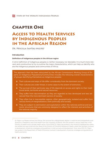 Chapter One Access to Health Services by Indigenous Peoples in the African Region Dr. Priscilla Santau Migiro7 Introduction Definition of indigenous peoples in the African region A strict definition of indigenous peoples is neither necessary nor desirable. It is much more relevant and constructive to try to outline the major characteristics, which can help us identify who are the indigenous peoples and communities of Africa. The approach that has been advocated by the African Commission’s Working Group of Experts on Indigenous Populations/Communities includes the following overall characteristics of groups identifying themselves as indigenous peoples: ɜɜ Their cultures and ways of life differ considerably from the dominant society; ɜɜ Their cultures are under threat, in some cases to the extent of extinction; ɜɜ T he survival of their particular way of life depends on access and rights to their traditional lands, territories and natural resources; ɜɜ T hey suffer from discrimination as they are regarded as less developed and less advanced than the more dominant sectors of society; ɜɜ T hey often live in inaccessible regions, often geographically isolated and suffer from various forms of marginalization, both politically and socially. ɜɜ T hey are subject to domination and exploitation within the national political and economic structures that are commonly designed to reflect the interests and activities of the national majority.