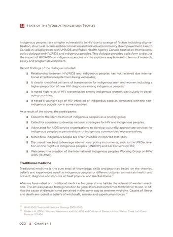 Indigenous peoples face a higher vulnerability to HIV due to a range of factors including stigmatization, structural racism and discrimination and individual/community disempowerment. Health Canada in collaboration with UNAIDS and Public Health Agency Canada hosted an International policy dialogue on HIV/AIDS and indigenous peoples. This dialogue provided a platform to discuss the impact of HIV/AIDS on indigenous peoples and to explore a way forward in terms of research, policy and program development. Report findings of the dialogue included: ɜɜ R elationship between HIV/AIDS and indigenous peoples has not received due international attention despite them being vulnerable; ɜɜ I t clearly identified patterns of transmission for indigenous men and women including a higher proportion of new HIV diagnoses among indigenous peoples; ɜɜ I t noted high rates of HIV transmission among indigenous women, particularly in developing countries; ɜɜ I t noted a younger age of HIV infection of indigenous peoples compared with the nonindigenous population in some countries. As a result of the above, the participants: ɜɜ Called for the identification of indigenous peoples as a priority group; ɜɜ Called for countries to develop national strategies for HIV and indigenous peoples; ɜɜ A dvocated for AIDS service organizations to develop culturally appropriate services for indigenous peoples in partnership with indigenous communities’ representatives; ɜɜ Noted how indigenous people are often invisible in reported statistics; ɜɜ D iscussed how best to leverage international policy instruments, such as the UN Declaration on the Rights of indigenous peoples (UNDRIP) and ILO Convention 169; ɜɜ W elcomed the creation of the International indigenous peoples Working Group on HIV/ AIDS (IIHAWG).