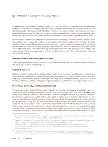 Providing a culturally sensitive health service Indigenous peoples in the African region, apart from having poor access to quality health services, also find the available services are not friendly. At most times the health workers look down upon them as “backward and primitive” peoples. Indigenous peoples also have the problem of language barriers and therefore use health facilities only when their conditions are advanced. As previously stated, cultural sensitivity is important if available health services are to be utilized. Also taking into account traditional knowledge which indigenous communities have relied on for thousands of years is extremely important. In South Africa, Ngomane et al. found that pregnant women in rural districts delayed visiting clinics, preferring instead to be looked after by traditional healers in order to protect their unborn infants from harm.58 They also shied away from delivery in hospitals because of the harsh treatment they received from the nurses. 55