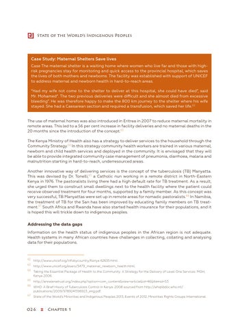 The use of maternal homes was also introduced in Eritrea in 2007 to reduce maternal mortality in remote areas. This led to a 56 per cent increase in facility deliveries and no maternal deaths in the 20 months since the introduction of the concept.63 The Kenya Ministry of Health also has a strategy to deliver services to the household through the Community Strategy.64 In this strategy community health workers are trained in various maternal, newborn and child health services and deployed in the community. It is envisaged that they will be able to provide integrated community case management of pneumonia, diarrhoea, malaria and malnutrition starting in hard-to-reach, underresourced areas. Another innovative way of delivering services is the concept of the tuberculosis (TB) Manyatta. This was devised by Dr. Tonelli,65 a Catholic nun working in a remote district in North-Eastern Kenya in 1976. The pastoralists living there had a high default rate for TB treatment. As a result, she urged them to construct small dwellings next to the health facility where the patient could receive observed treatment for four months, supported by a family member. As this concept was very successful, TB Manyattas were set up in remote areas for nomadic pastoralists.66 In Namibia, the treatment of TB for the San has been improved by educating family members on TB treatment.67 South Africa and Rwanda have also started health insurance for their populations, and it is hoped this will trickle down to indigenous peoples.