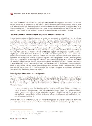 Development of responsive health policies The foundation of having best practices in delivering health care to indigenous peoples is for states to embrace multicultural health systems. The World Health Organization asserts that all people have the right to health. During the fiftieth anniversary celebration of the Universal Declaration on Human Rights on 8 December 1998 in Paris, the WHO Director General Dr. Gro Harlem Brundtland said: “It is no coincidence that the idea to establish a world health organization emerged from the same process that identified the universal value of human rights. The WHO constitution states the enjoyment of the highest attainable standard of health is one of the fundamental rights of every human being without distinction of race, religion, and political beliefs, economic or social condition”. In most state health systems cultures and views of indigenous peoples are ignored or dismissed as health systems are based exclusively on western medicine. This approach marginalizes indige-