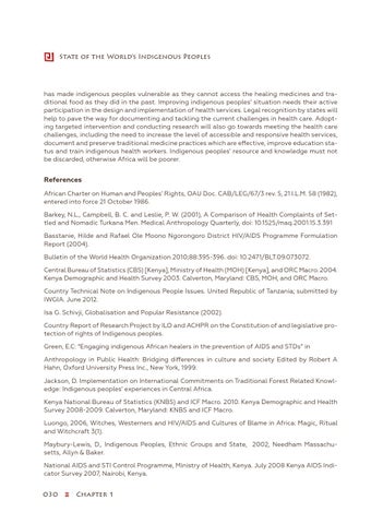 References African Charter on Human and Peoples’ Rights, OAU Doc. CAB/LEG/67/3 rev. 5, 21 I.L.M. 58 (1982), entered into force 21 October 1986. Barkey, N.L., Campbell, B. C. and Leslie, P. W. (2001), A Comparison of Health Complaints of Settled and Nomadic Turkana Men. Medical Anthropology Quarterly, doi: 10.1525/maq.2001.15.3.391 Basstanie, Hilde and Rafael Ole Moono Ngorongoro District HIV/AIDS Programme Formulation Report (2004). Bulletin of the World Health Organization 2010;88:395-396. doi: 10.2471/BLT.09.073072. Central Bureau of Statistics (CBS) [Kenya], Ministry of Health (MOH) [Kenya], and ORC Macro. 2004. Kenya Demographic and Health Survey 2003. Calverton, Maryland: CBS, MOH, and ORC Macro. Country Technical Note on Indigenous People Issues. United Republic of Tanzania; submitted by IWGIA. June 2012. Isa G. Schivji, Globalisation and Popular Resistance (2002). Country Report of Research Project by ILO and ACHPR on the Constitution of and legislative protection of rights of Indigenous peoples. Green, E.C: “Engaging indigenous African healers in the prevention of AIDS and STDs” in Anthropology in Public Health: Bridging differences in culture and society Edited by Robert A Hahn, Oxford University Press Inc., New York, 1999. Jackson, D. Implementation on International Commitments on Traditional Forest Related Knowledge: Indigenous peoples’ experiences in Central Africa. Kenya National Bureau of Statistics (KNBS) and ICF Macro. 2010. Kenya Demographic and Health Survey 2008-2009. Calverton, Maryland: KNBS and ICF Macro. Luongo, 2006, Witches, Westerners and HIV/AIDS and Cultures of Blame in Africa: Magic, Ritual and Witchcraft 3(1). Maybury-Lewis, D., Indigenous Peoples, Ethnic Groups and State, 2002, Needham Massachusetts, Allyn & Baker. National AIDS and STI Control Programme, Ministry of Health, Kenya. July 2008 Kenya AIDS Indicator Survey 2007, Nairobi, Kenya.