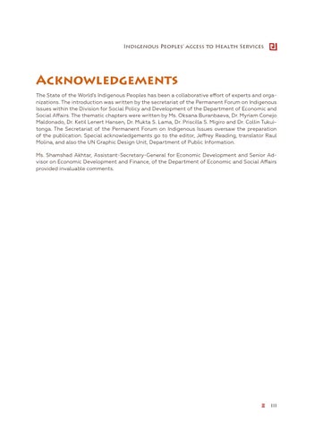 Acknowledgements The State of the World’s Indigenous Peoples has been a collaborative effort of experts and organizations. The introduction was written by the secretariat of the Permanent Forum on Indigenous Issues within the Division for Social Policy and Development of the Department of Economic and Social Affairs. The thematic chapters were written by Ms. Oksana Buranbaeva, Dr. Myriam Conejo Maldonado, Dr. Ketil Lenert Hansen, Dr. Mukta S. Lama, Dr. Priscilla S. Migiro and Dr. Collin Tukuitonga. The Secretariat of the Permanent Forum on Indigenous Issues oversaw the preparation of the publication. Special acknowledgements go to the editor, Jeffrey Reading, translator Raul Molina, and also the UN Graphic Design Unit, Department of Public Information. Ms. Shamshad Akhtar, Assistant-Secretary-General for Economic Development and Senior Advisor on Economic Development and Finance, of the Department of Economic and Social Affairs provided invaluable comments.