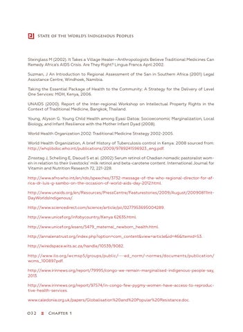 World Health Organization 2002: Traditional Medicine Strategy 2002-2005. World Health Organization, A brief History of Tuberculosis control in Kenya: 2008 sourced from: http://whqlibdoc.who.int/publications/2009/9789241596923_eng.pdf. Zinsstag J, Schelling E, Daoud S et al. (2002) Serum retinol of Chadian nomadic pastoralist women in relation to their livestocks’ milk retinol and beta-carotene content. International Journal for Vitamin and Nutrition Research 72, 221-228. http://www.afro.who.int/en/rdo/speeches/3732-message-of-the-who-regional-director-for-africa-dr-luis-g-sambo-on-the-occasion-of-world-aids-day-2012.html. http://www.unaids.org/en/Resources/PressCentre/Featurestories/2009/August/20090811IntDayWorldsIndigenous/. http://www.sciencedirect.com/science/article/pii/0277953695004289. http://www.unicef.org/infobycountry/Kenya 62635.html. http://www.unicef.org/esaro/5479_maternal_newborn_health.html. http://annalenatrust.org/index.php?option=com_content&view=article&id=46&Itemid=53. http://wiredspace.wits.ac.za/handle/10539/9082. http://www.ilo.org/wcmsp5/groups/public/---ed_norm/-normes/documents/publication/ wcms_100897.pdf. http://www.irinnews.org/report/79995/congo-we-remain-marginalised-indigenous-people-say, 2013. http://www.irinnews.org/report/97574/in-congo-few-pygmy-women-have-access-to-reproductive-health-services. www.caledonia.org.uk/papers/Globalisation%20and%20Popular%20Resistance.doc.